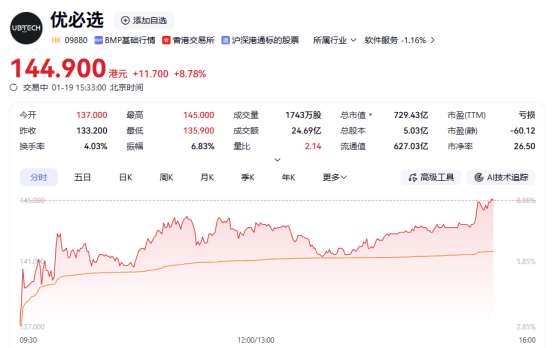 上证报中国证券网讯(李子健记者周亮)1月19日,优必选股价震荡走高,截至15时33分,公司股价上涨8.78%至144.90港元/股。